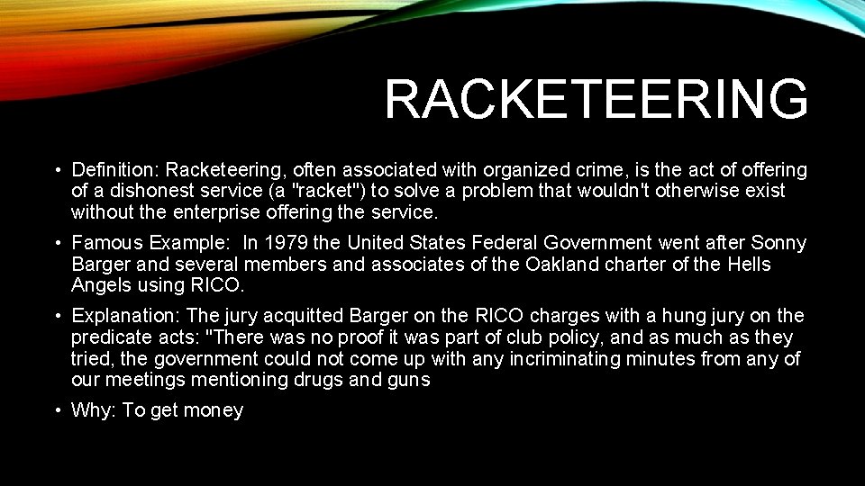 The case was one of the first instances of racketeering charges being used against someone outside of the circle of organized crime. Racketeering is making money from illegal activities such as threatening people or.